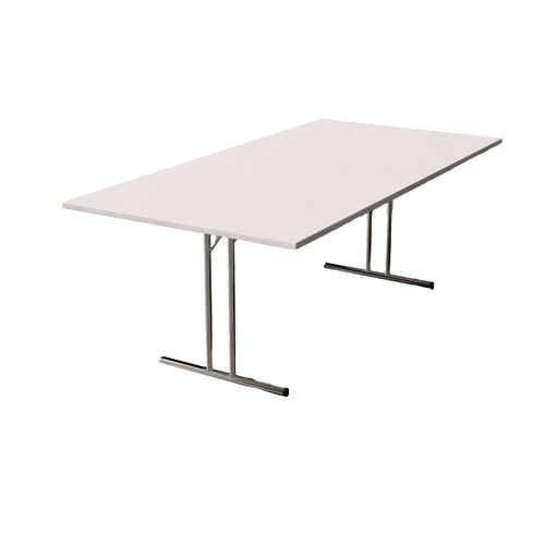 Tavolo con ripiano in nobilitato e gambe pieghevoli in metallo cromato tubolare.